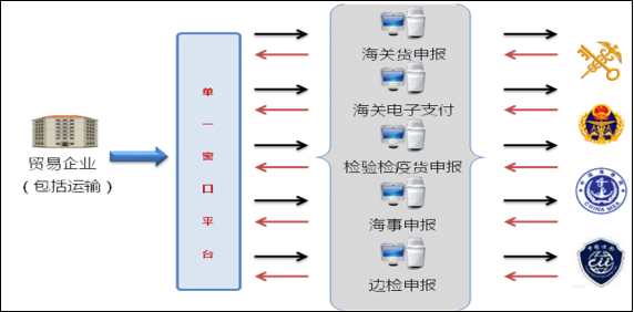 在口岸通关申报和监管的主要环节,货物进出口申报和运输工具申报,已实现企业通过“单一窗口”一次性提交申报信息,分别发送给监管单位系统,申报结果通过“单一窗口”反馈,监管单位通过“单一窗口”共享监管状态和结果信息。