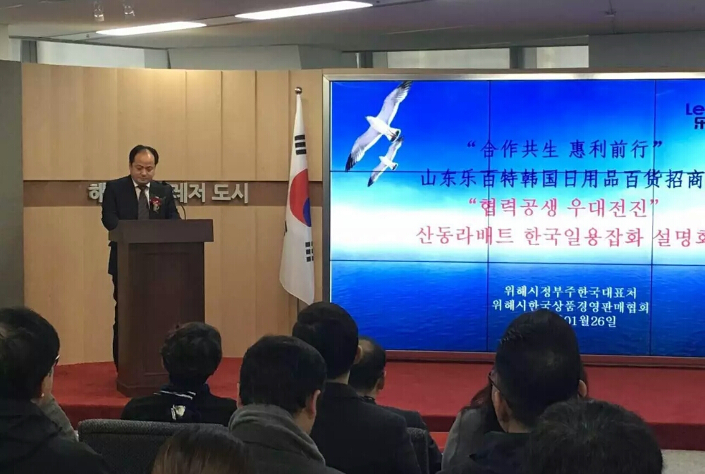 韩国时间1月26日10时,“合作共生 惠利前行”大型韩国日用百货招商会在韩国仁川·威海馆顺利召开。招商会由山东乐百特电子商务有限公司主办,威海市商务局、威海市政府驻韩国办事处、华东海运有限公司大力支持,威海韩国商品经销协会协办。仁川广域市副议长朴胜喜、理智约株式会社董事长金相用、东北亚投资集团部长孙光翼、韩中贸易协会会长金龙善等韩国各界嘉宾、108名企业代表、75家韩国企业出席了会议。