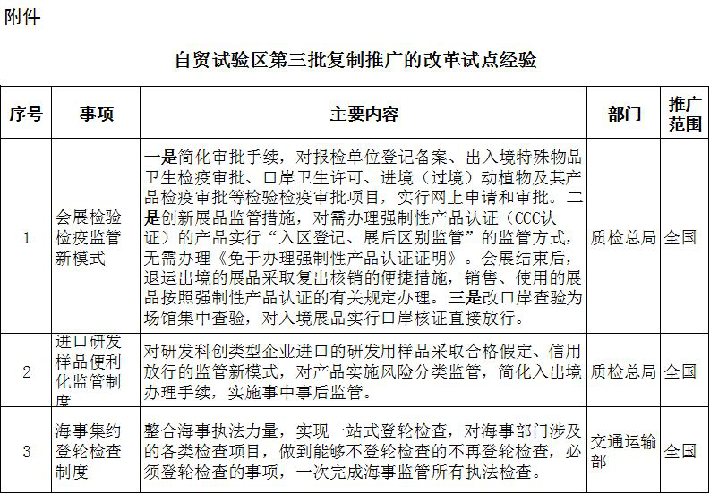 经商相关部门同意,自贸试验区第三批改革试点经验包括“会展检验检疫监管新模式”“进口研发样品便利化监管制度”“海事集约登轮检查制度”“融资租赁公司收取外币租金”“市场主体名称登记便利化改革”等5项内容,将向全国范围内复制推广。
