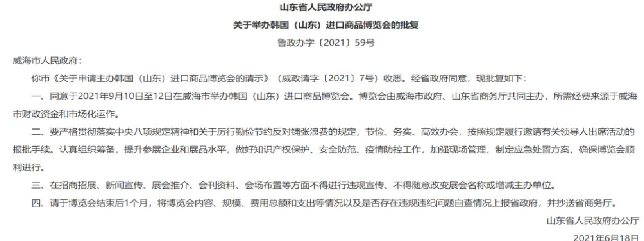 6月18日,山东省人民政府办公厅发布《关于举办韩国(山东)进口商品博览会的批复》(鲁政办字〔2021〕59号),同意我市于2021年9月10日-12日举办韩国(山东)进口商品博览会。本次活动由威海市人民政府与山东省商务厅共同主办,以“四港联动·中韩共赢”为主题,设置了中韩机器人产业合作论坛、中韩(威海)服务贸易创新发展论坛、中韩跨境电商大会、企业采购对接洽谈以及美妆、美食体验等丰富多彩的配套活动。以本次活动为契机,我市将进一步提升对韩经贸合作水平,着力打造“韩日商品集散地”,以更高水平的对外开放打造国际合作和竞争新优势,在构建“双循环”新发展格局中育新机、开新局。