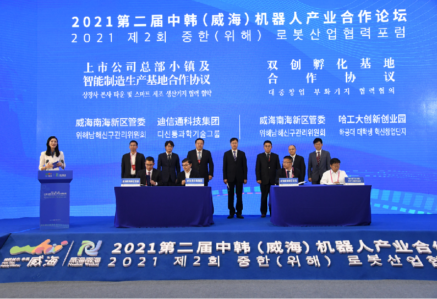 9月9日,2021第二届中韩(威海)机器人产业合作论坛成功在南海新区举办,本次论坛是韩国(山东)进口商品博览会的配套活动,主题为“共享智造新机遇 共创智慧新未来”,由威海市人民政府、韩国机器人产业协会共同举办,吸引了来自中韩政商界嘉宾、机器人领域知名企业负责人、行业内专家学者等近100名代表参会,共议产业智造新机遇。论坛设置了合作洽谈环节,邀请韩国仁川科技园、浦项国际、斗山机器人等机构、企业同迪信通科技、玄智科技等国内行业领军企业在会上交流探讨技术研究、产品开发、拓展应用市场等机器人产业领域前沿问题。会上还举行了集中签约仪式,威海南海新区分别与韩国富川产业振兴院、迪信通科技集团、哈尔滨工业大学大学生创新创业园签署合作协议。本次论坛活动有力促进了中韩间机器人产业全方位深层次合作,进一步提升我市在中韩机器人合作领域的影响力。